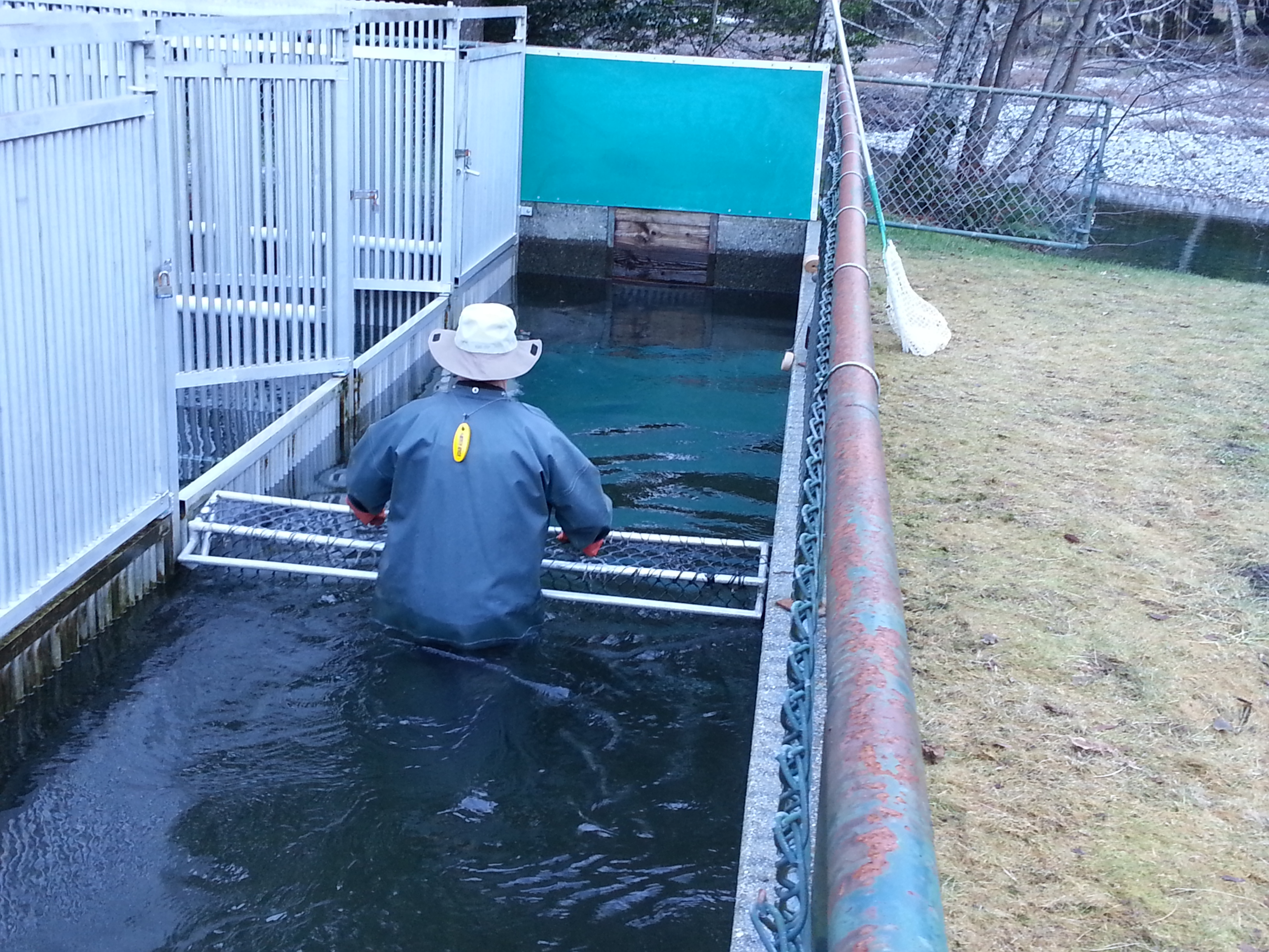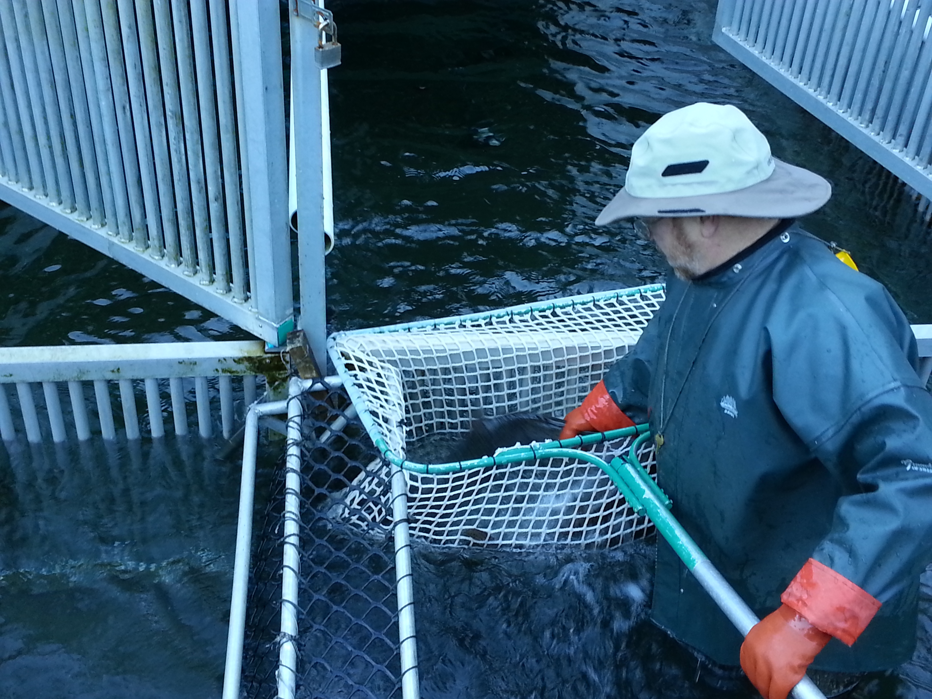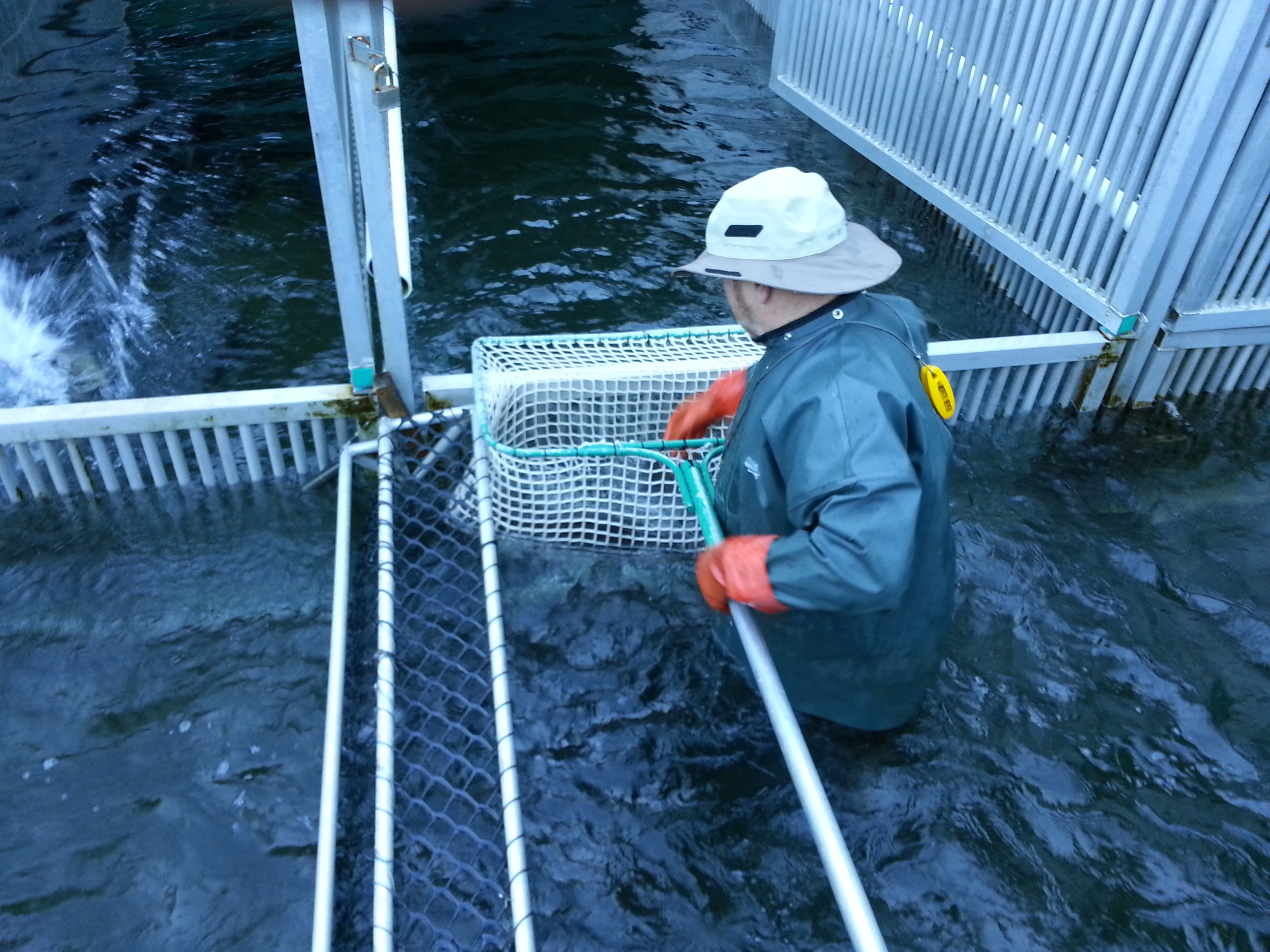 When salmon enter the traps, they are collected in holding pens. Younger salmon four to five years old, sometimes referred to as Jacks or Jennys, are released. Older mature fish are kept.
