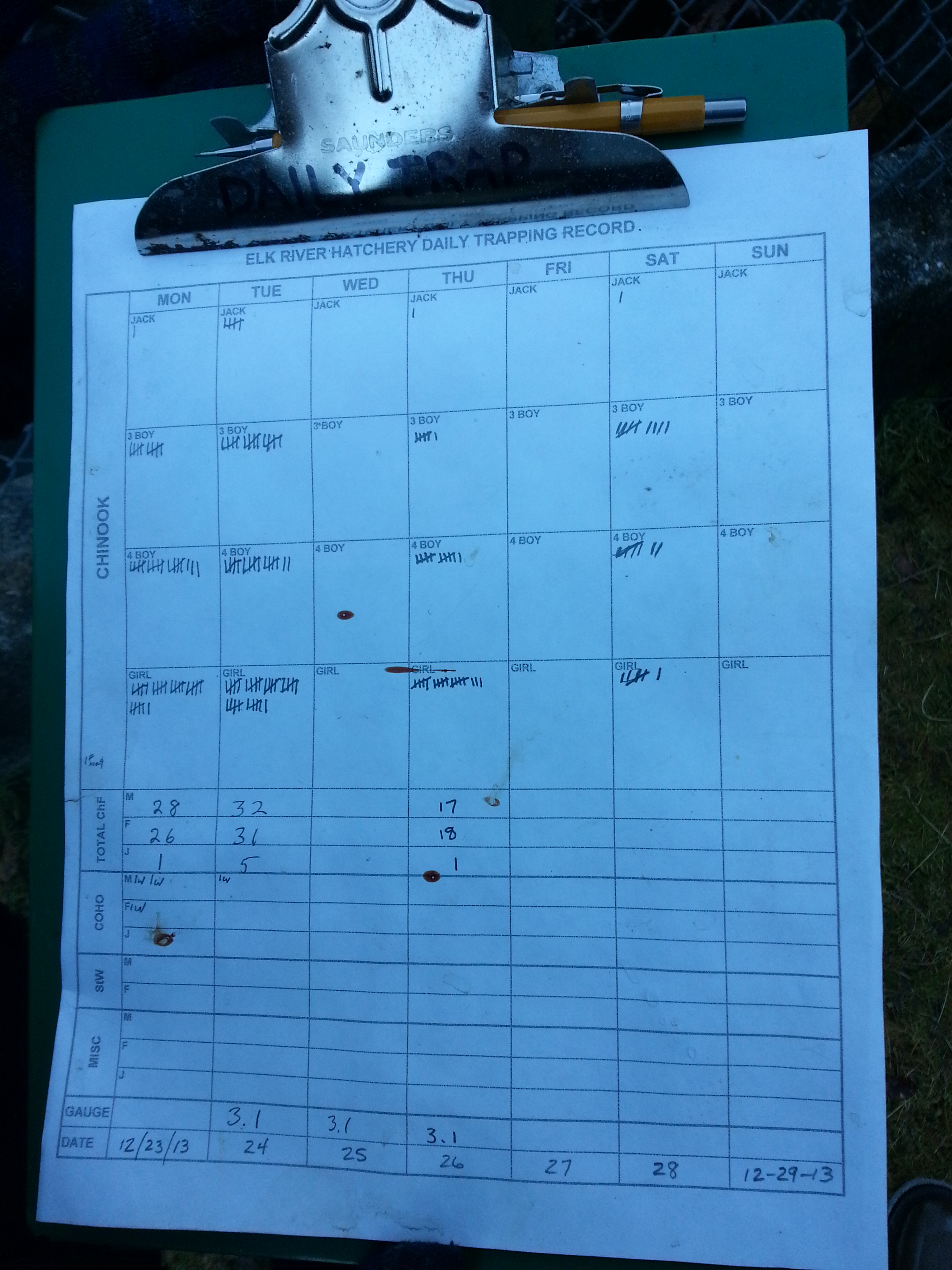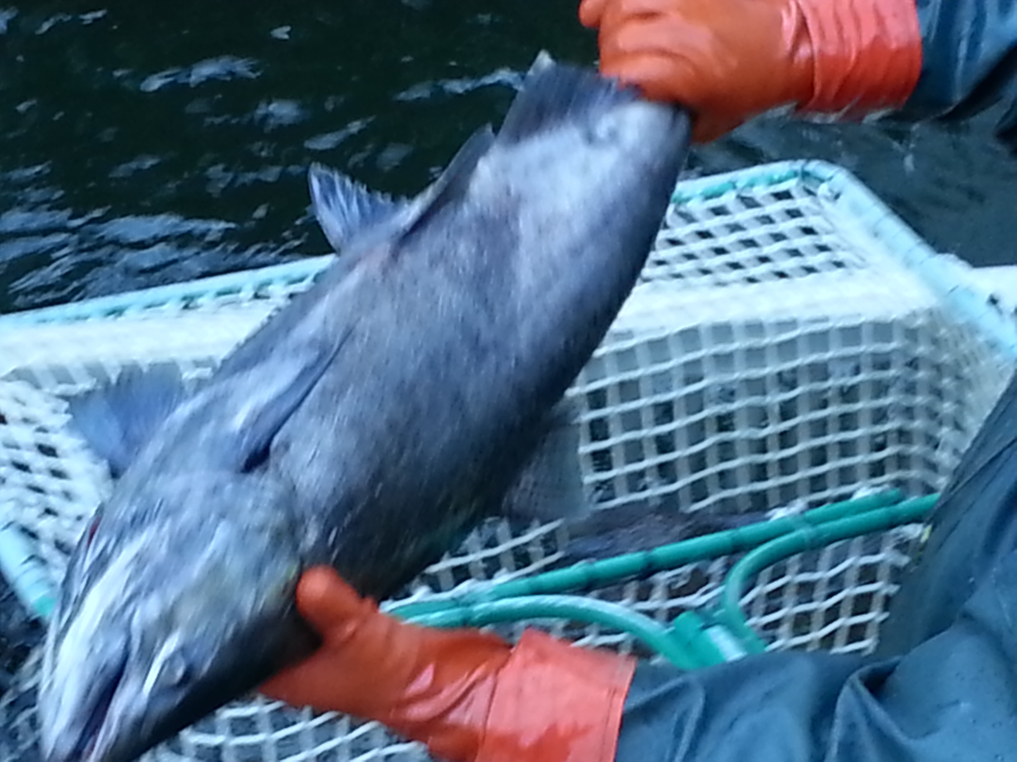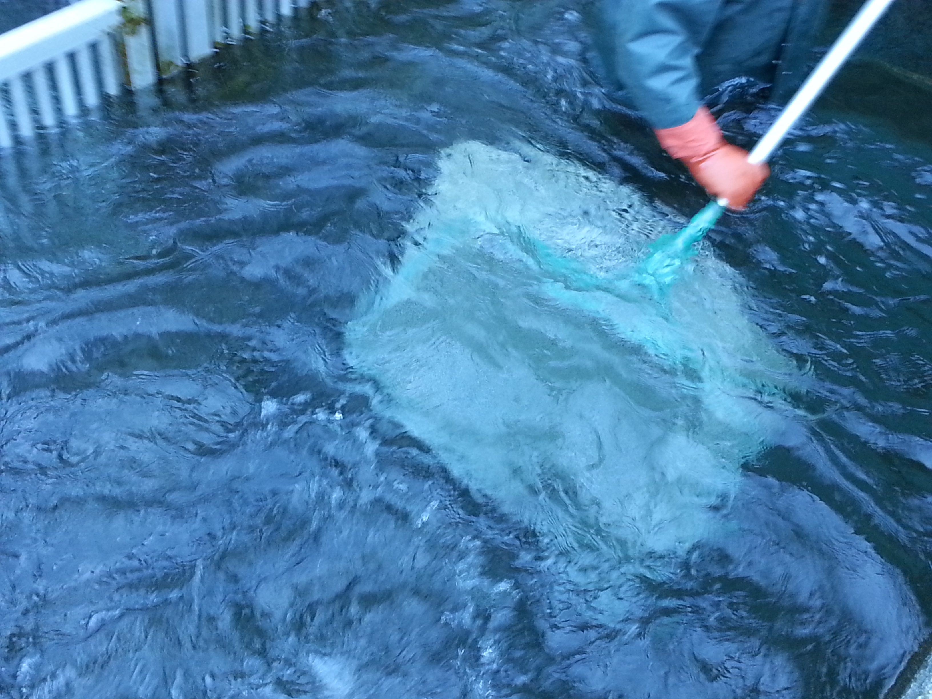 When salmon enter the traps, they are collected in holding pens. Younger salmon four to five years old, sometimes referred to as Jacks or Jennys, are released. Older mature fish are kept.