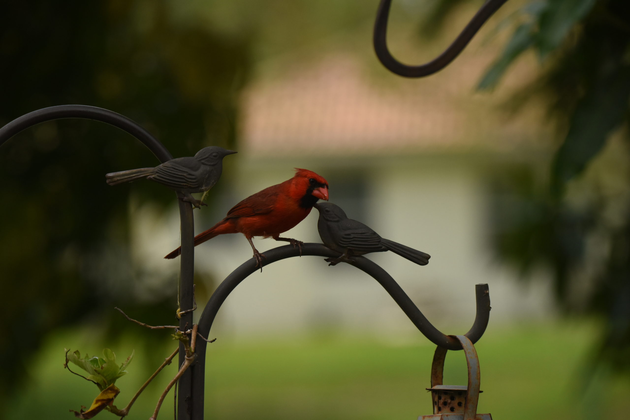 I watch him sometimes as he sits in the mango tree and seems to be content just watching everything going on around him. When his mate is around, he is very attentive. He is fiercely protective. He also feeds her from the seeds at the feeder. I will have to post some pictures of that. It must be part of the bonding routine.